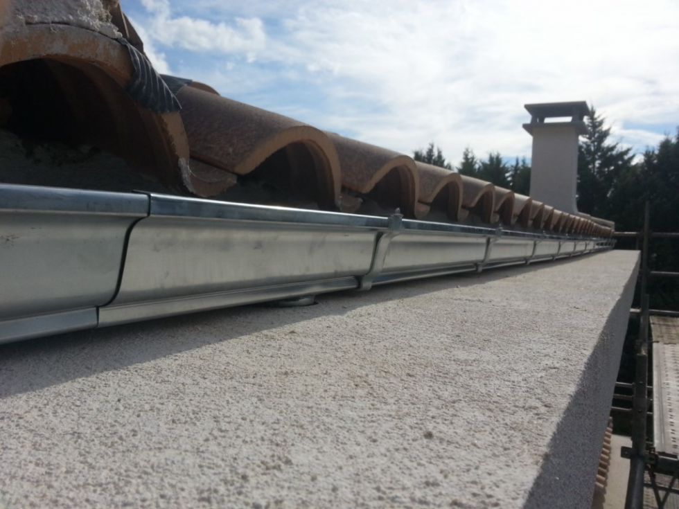 Les gouttières mouluré en zinc ont était posée aux crochets bandeau fixée directement sur l'arase en béton.