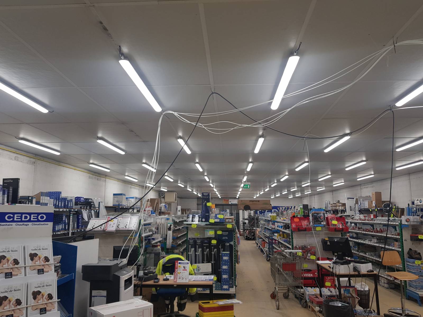 Afin de permettre une meilleur visibilité dans un magasin nous avons réalisé le remplacement de tous l'éclairage en néon par des Réglettes étanche à LED.