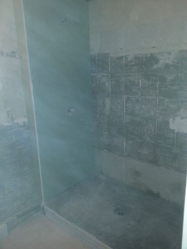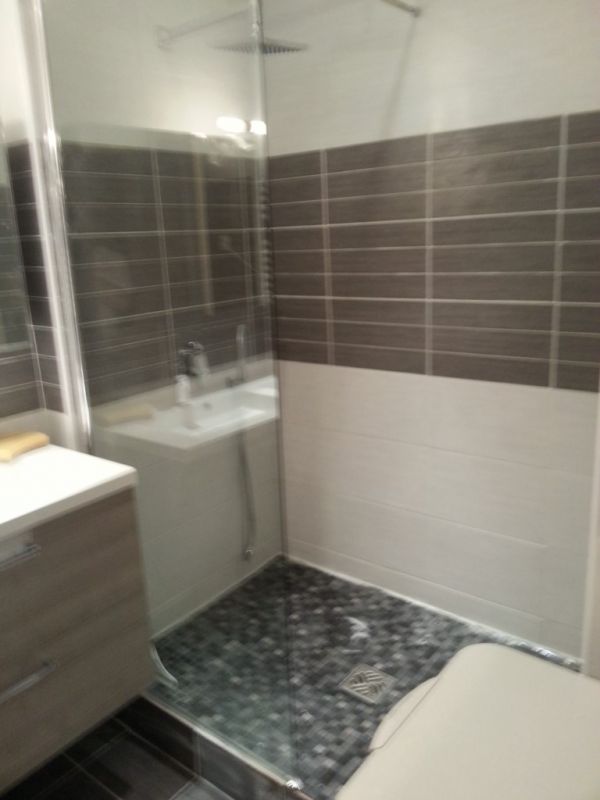 La baignoire fut supprimée afin de laisser place à une douche à l'italienne carreler avec de la mosaïque,la pose d une paroi de douche en verre a également était réaliser pour éviter les projections d'eau.