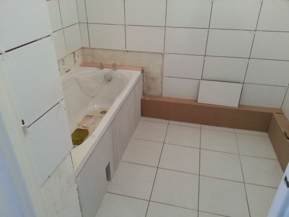 Dans la rénovation de cette de salle de bain nous avons tout changer, la baignoire en fonte a était remplacer par une baignoire en acrylique et le tablier en syporex , nous avons réalisé un coffrage en medium afin de masqué les arrivées et les évacuations de plomberie et la pose d'un meuble vasque avec miroir a également était réalisé par nos soins.